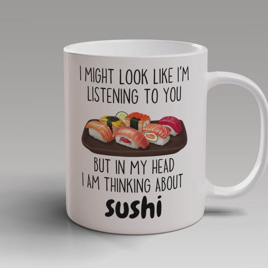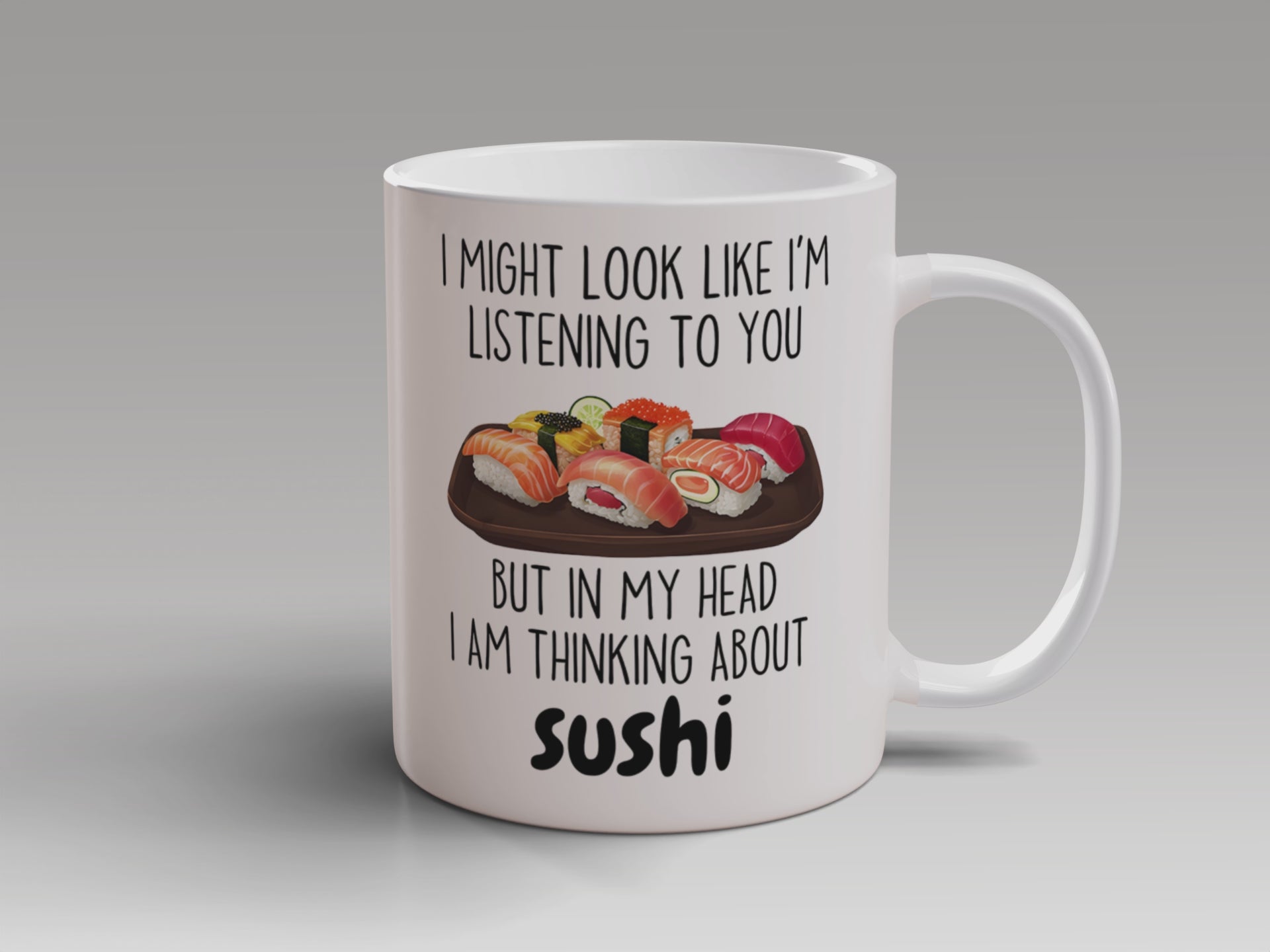 Funny Sushi Lover Mug – “I Might Look Like I’m Listening To You But In My Head I’m Thinking About Sushi” | Japanese Food Gift, Cute Coffee Cup For Sushi Fans