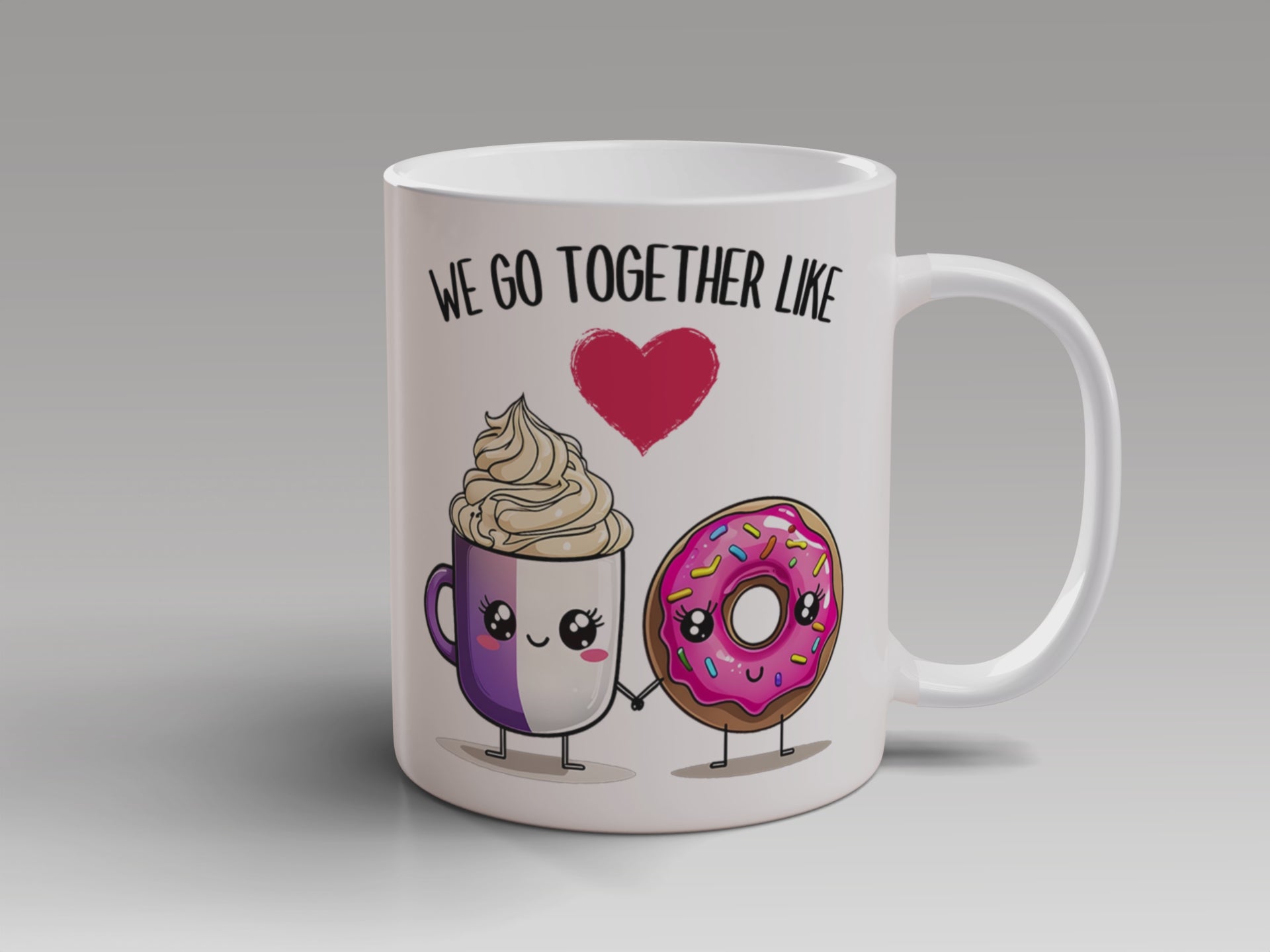 This “We Go Together Like” Coffee & Donuts Mug is the perfect way to show your sweet side. Featuring two adorable characters — a smiling cup of coffee and a happy donut — this mug celebrates love, friendship, and all things cute and cozy.