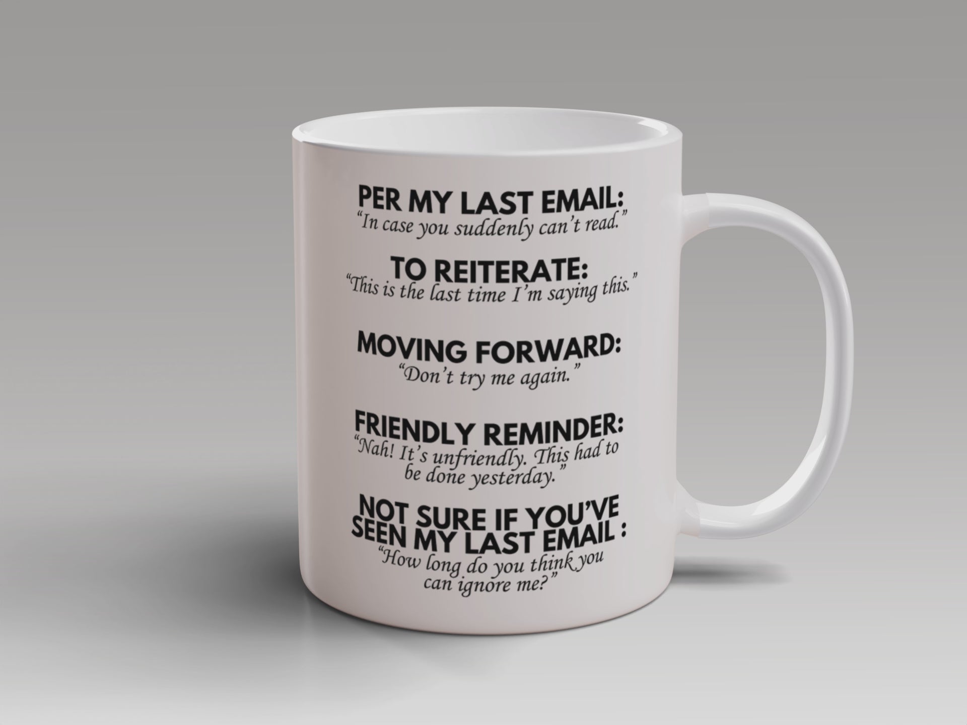 The “Per My Last Email” mug hilariously breaks down all those polite-but-petty email phrases we’ve all used. From “To Reiterate” to “Friendly Reminder,” it says exactly what you’re really thinking — without having to hit send.