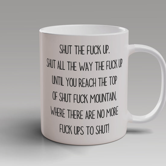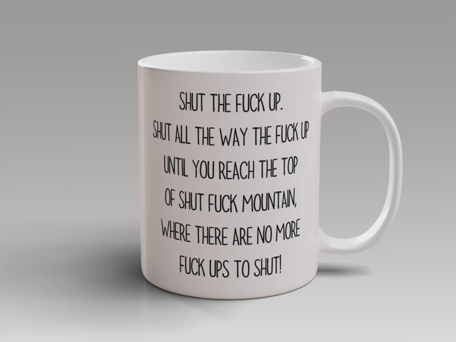 Featuring the iconic “Shut F*** Mountain” quote, this mug delivers peak sarcasm with unapologetic energy. Made from high-quality ceramic, it’s microwave and dishwasher safe, printed on both sides, and available in multiple sizes and colors.