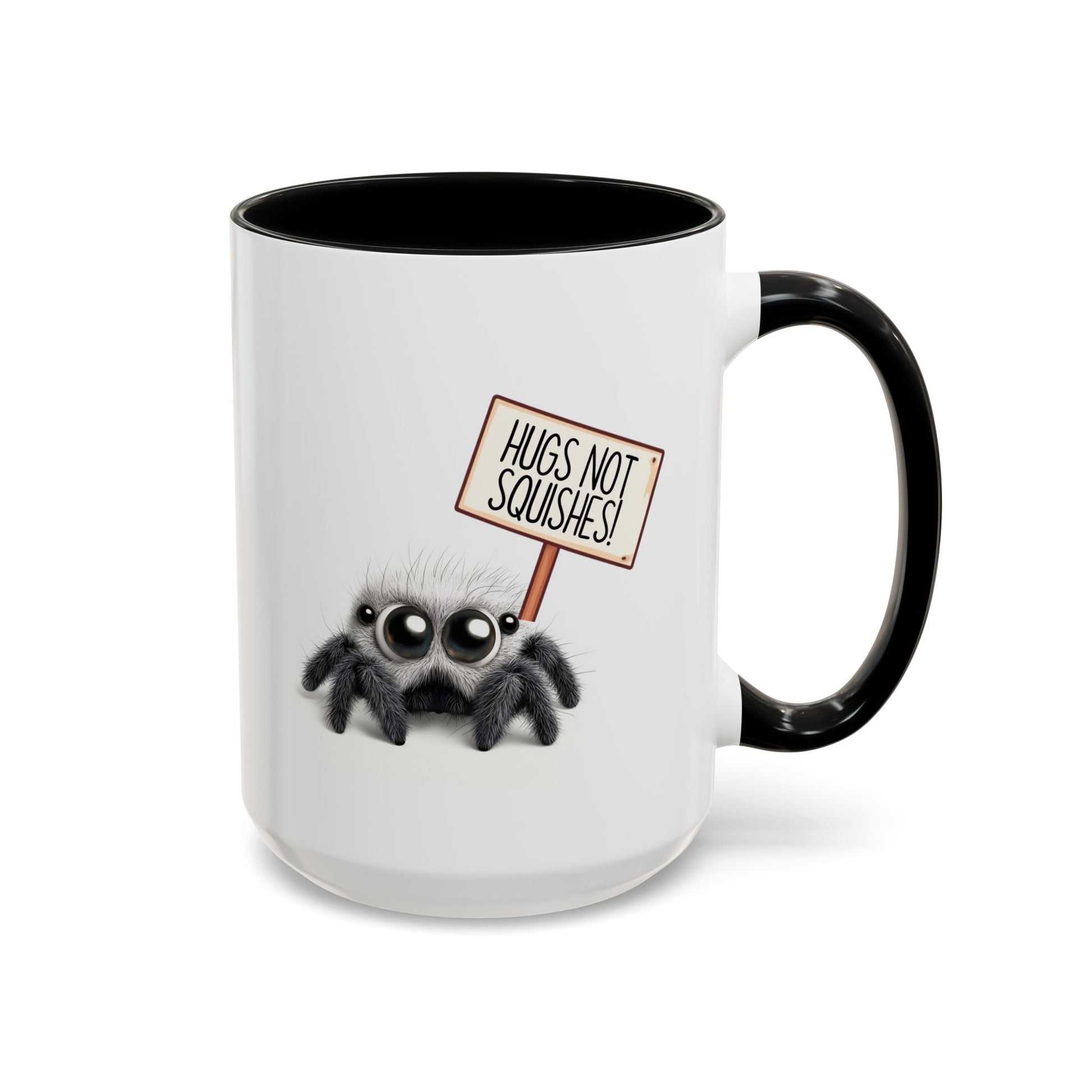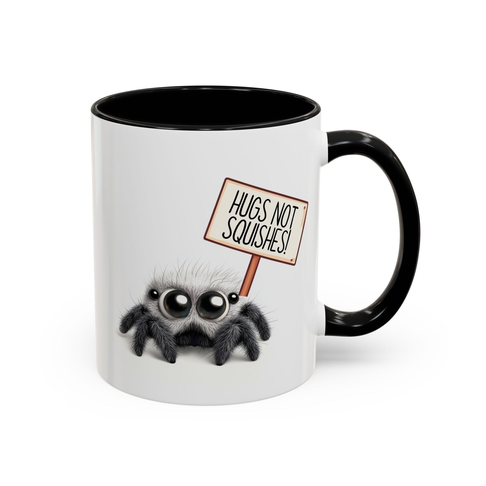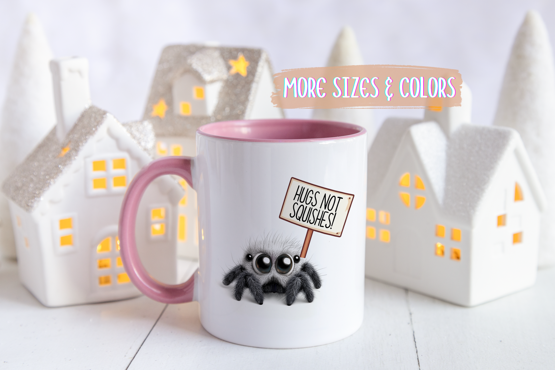 Cute Spider Mug – “Hugs Not Squishes” – Funny Custom Made Gift for Bug Lovers & Nature Fans